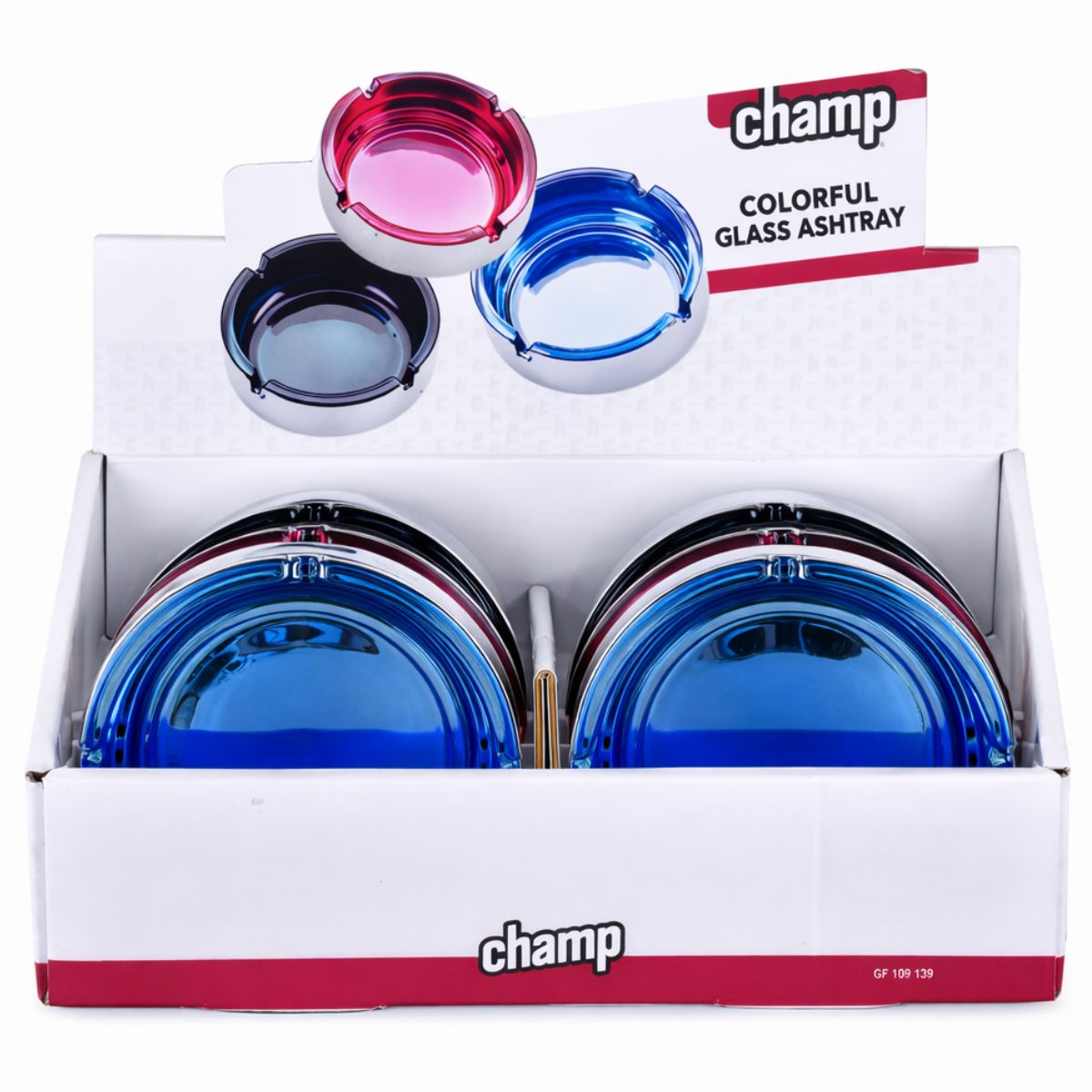 Produced by Champ High, these ashtrays are supplied as a coordinated set within a compact countertop display. The assortment format supports curated merchandising, making it ideal for retailers looking to offer visually engaging glass accessories without committing to large display footprints.
