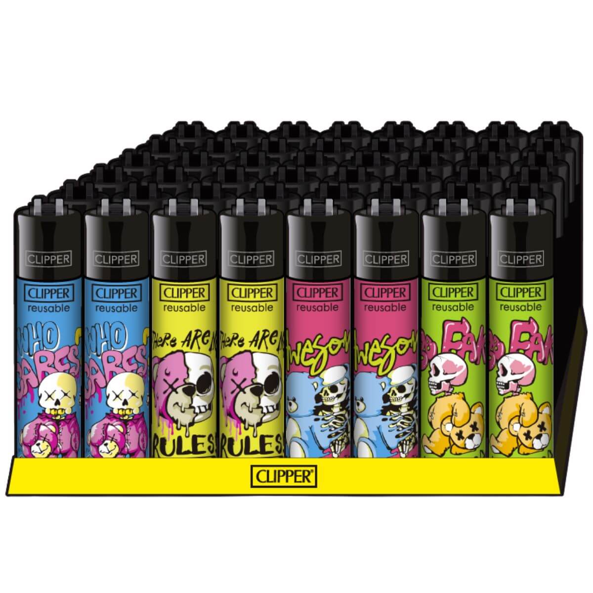 The Clipper Classic Large Bear Skulls 48pcs Display is a refillable flint lighter collection featuring the Bear Skulls themed graphic design. Manufactured in the standard Clipper Classic Large format, these lighters combine durable construction with collectible artwork, making them suitable for convenience stores, headshops, tobacco retailers, and lifestyle outlets.