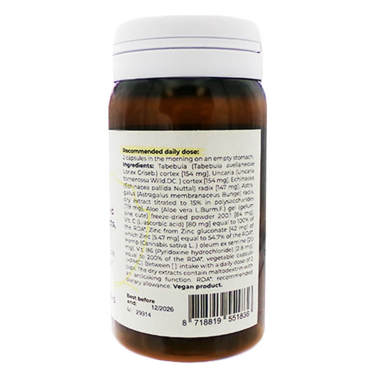 Ingredients: Tabebuia (Tabebuia avellanedae Lor.ex Griseb.) cortex [154 mg], Echinacea (Echinacea pallida Nuttal) radix [147 mg], Astragalus (Astragalus membranaceus Bunge) radix. Dry extract titrated to 15% in polysaccharides [119 mg], Aloe (Aloe vera L.Burm.F.) gel (gelum sine cute) freeze-dried powder 200:1 [84 mg], Vit. C (L-absorbic acid) [80 mg] equal to 100% of the RDA*, Zinc from Zinc gluconate [42 mg] of which Zinc [5.47 mg] equal to 54.7% of the RDA*, Hemp (Cannabis sativa L.) oleum ex semine [20 mg], Vit. B6 (Pyridoxine hydrochloride) [2.8 mg] equal to 200% of the RDA*, vegetable capsule (HPMC). The dry extracts contain maltodextrin with an anticaking function. RDA*: recommended dietary allowance. Vegan product.
